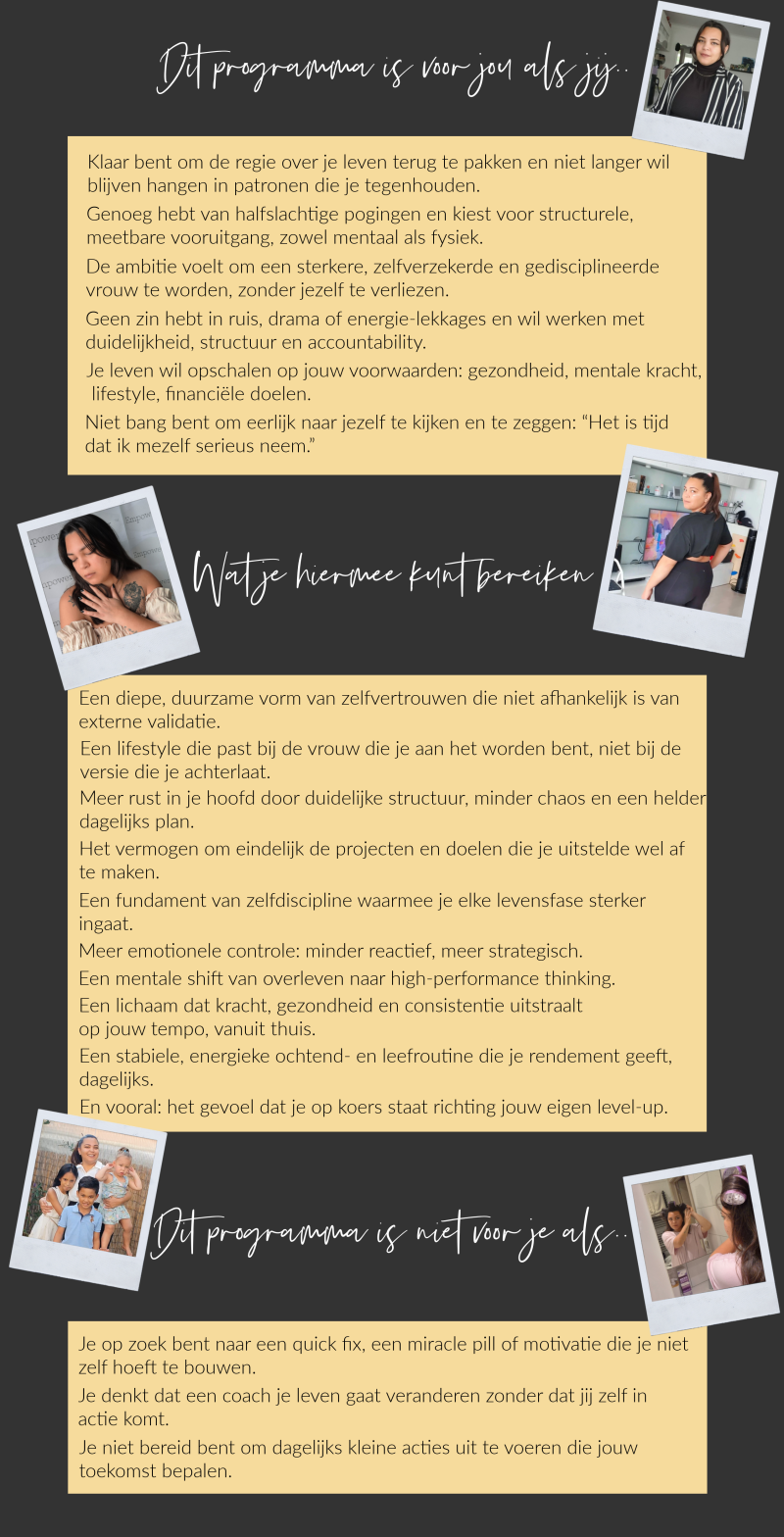 Ik ben Laïkiepina, ik kwam zelf uit diepe depressie en heb mezelf opgebouwd tot wie ik nu ben. Mijn missie: vrouwen laten zien dat echte verandering mogelijk is. Met een plan, discipline en zelfcompassie. Ik leid deze methode persoonlijk en blijf betrokken bij transformationele cases.