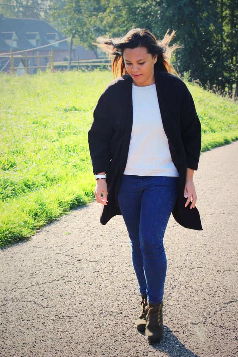 Zo’n oversized, licht versleten shirt — halve schouder bloot, een gat in de rug, vintage vibes. Comfort boven alles. Ik stak het een beetje nonchalant in mijn broek, deed een deftige broek aan, nam mijn handtas en zonnebril… en ging.
